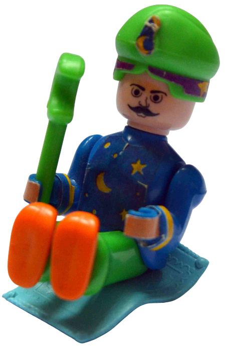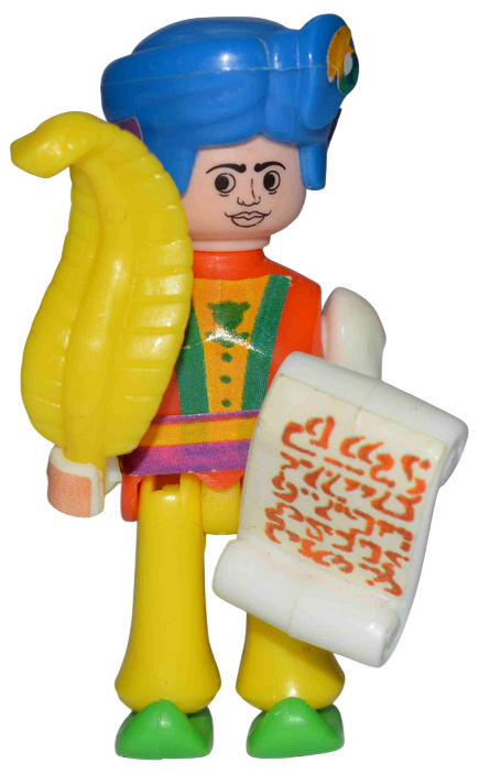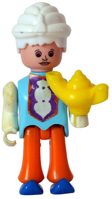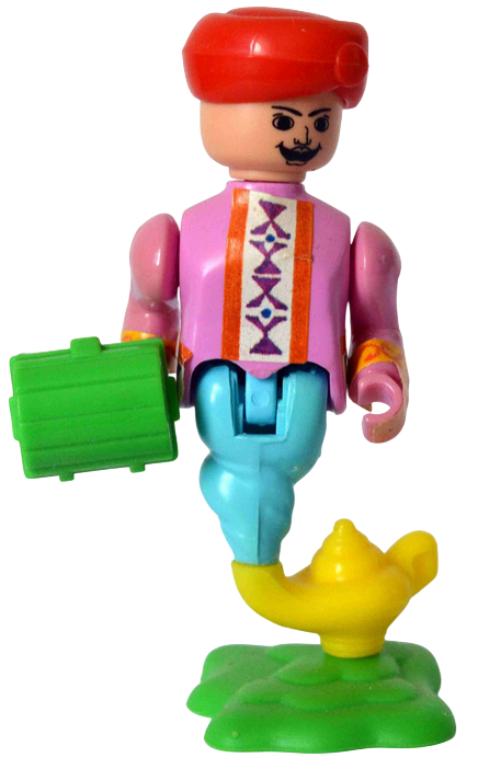 Prinzessin, Wächter mit Schild und Waffe, Sultan auf fliegendem Teppich, Flaschengeist mit Schatztruhe, Junge mit Wunderlampe, Schatzmeister mit Feder und Blatt